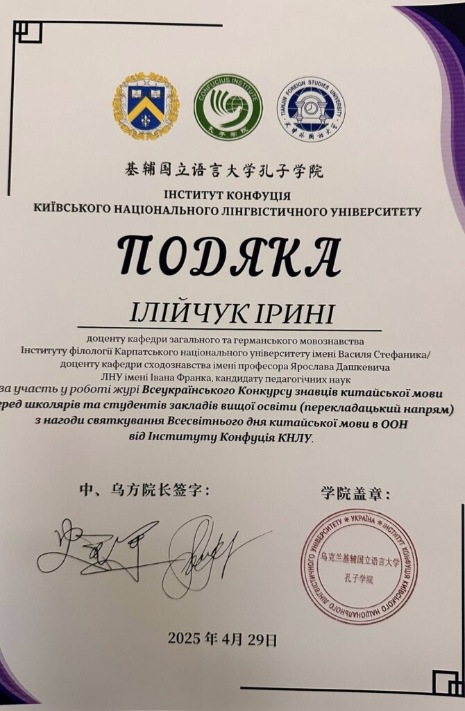 Доцентка кафедри загального та германського мовознавства Карпатського національного університету імені Василя Стефаника Ірина Ілійчук була запрошена до складу журі Всеукраїнського конкурсу перекладу з китайської мови, організованого Інститутом Конфуція Київського національного лінгвістичного університету. Пані Ірину вже неодноразово запрошують як експертку й Читати далі